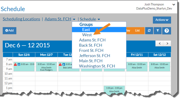 Select the arrow next to the scheduling location name in the bread crumbs and select the scheduling location group you want to view the schedules for.