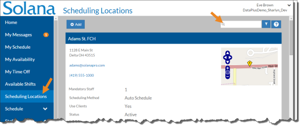 Select Scheduling Locations from the menu and then enter the name of the scheduling location in the Search box.