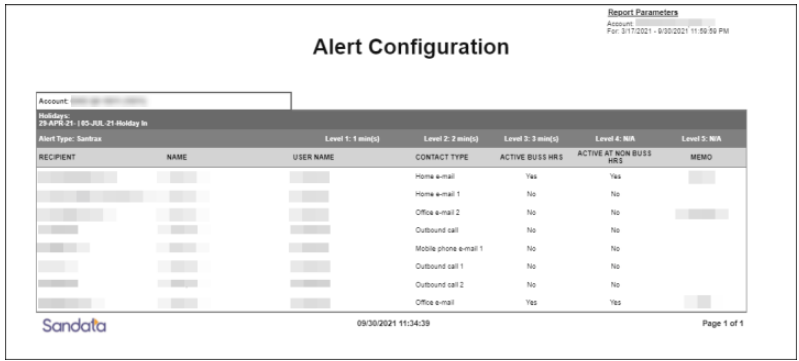 This report displays the alert configuration for the account. The report includes information about the type of alert, the thresholds for the when the alerts are sent for each level and information about who the alerts are sent to. If holidays are configured for the account, they are included in the report output. Alert behavior may vary for configured holidays.