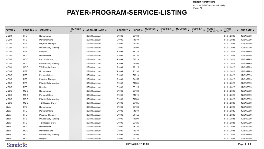 Use this report to review the payer, program and service hierarchy as well as the start and end dates for services. The report also displays any modifiers applied to services and whether nor not the service is required by the Cures Act. The report can assist providers in reviewing the payer configuration for the program. It can also help payers review the current communication before communicating with providers.