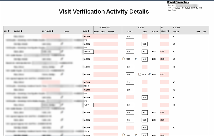 This report shows all visits taking place for a specific day and the activity that was performed in Visit Maintenance on those visits. The report displays visit information including client name, employee name, call in and call out time as well as additional visit information including scheduled visit times, and billing information.