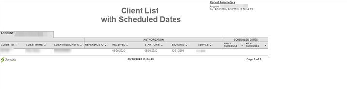 This report shows a list of all clients with schedules. The report displays authorization information and the dates for the client’s first and next schedule.
