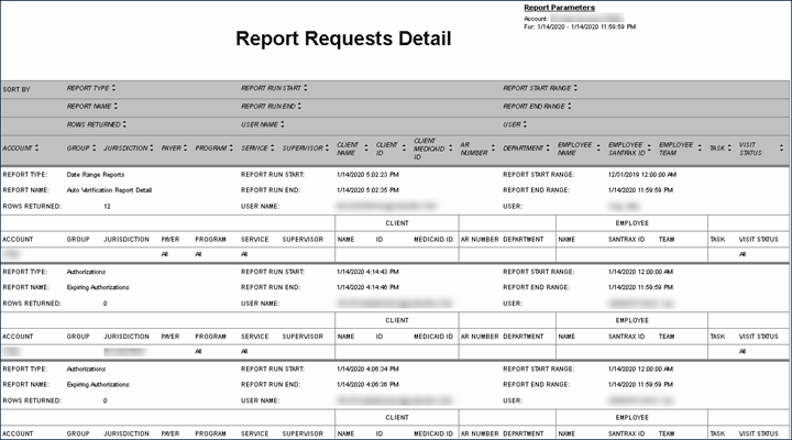This report shows all report requests made on a specific date. The report provides the username of the requester, the report ran, times and report length. The maximum range of this report is 1 day.