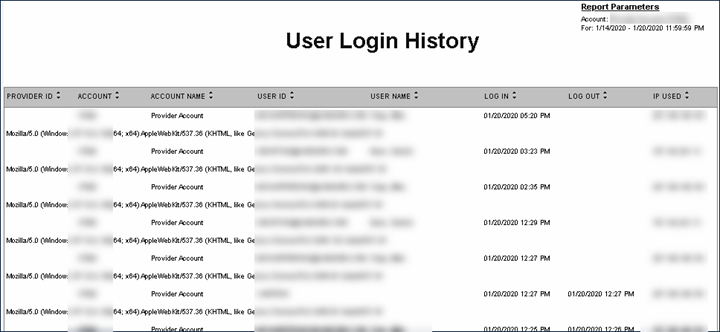 Use this report to allow authorized users to view all user login activity. This report can assist with audits and be useful to identify trends or patterns within or across providers.