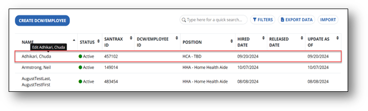 - Use the quick search, then select the DCW/Employee’s name to open the direct care work or employee profile.