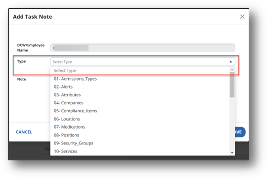 - Select Type of note being added from the drop-down menu.