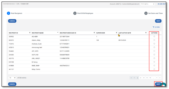 - Select a DCW/Employee to add to the visit using the Actions button. Select Next.