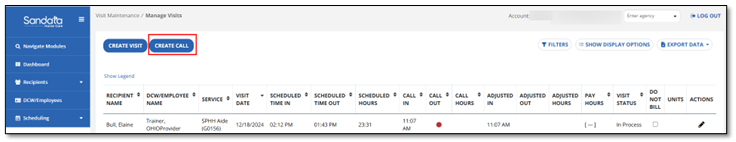 Use the Create Call function when there is no in call for a visit. For example, if the DCW/Employee forgot to call in you create the call-in using Create Call. If the DCW/Employee is still on the visit, they may use the app or TVV to call out.