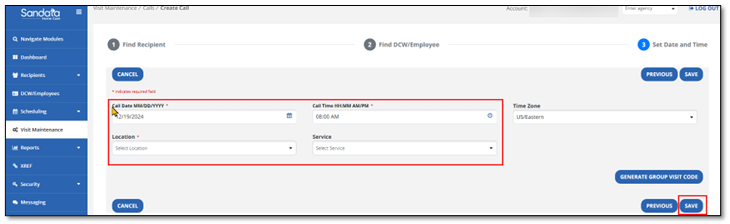 - In the next screen, enter the Call Date and Call Time. Then enter the Location and Service (if available).