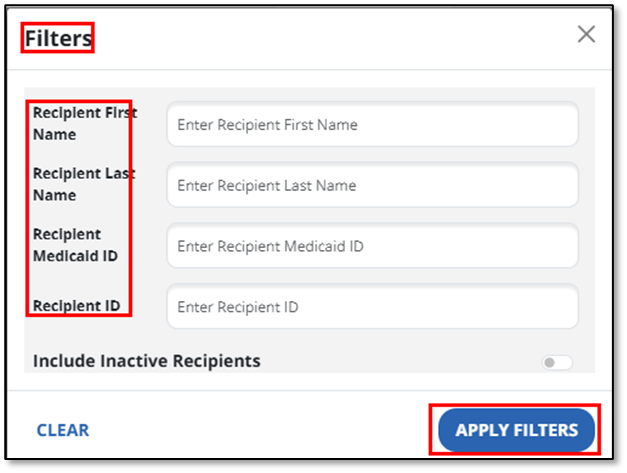 - Enter the Recipients first or last name, Medicaid ID, or Recipient ID and then select Apply Filters.