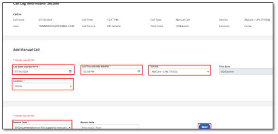 - If both calls were missing, once the call in has been added and saved, you will receive additional prompts to Add a Manual Call. This will be your call out. The call in will appear at the top of the window.