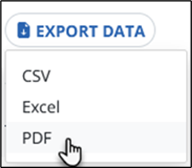 Note: The formats available for export vary by module, and may include CSV, Excel, and Adobe Acrobat (PDF).