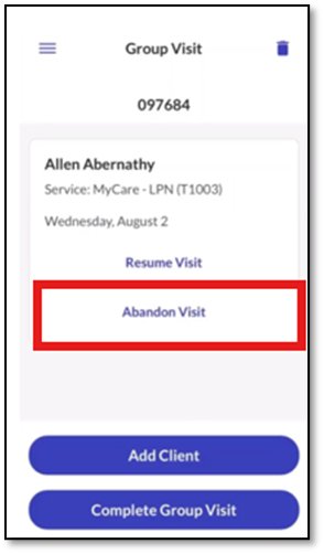 NOTE: When abandoning a group visit, all the DCW/Employee’s visits within the group appear in Sandata EVV as an incomplete visit and must be verified in Visit Maintenance.