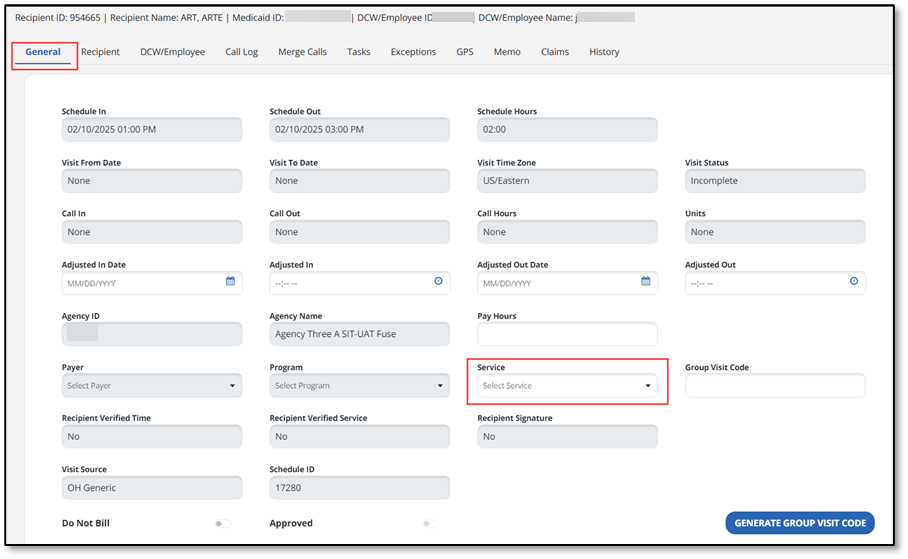 - In the General tab of visit details, choose the correct Service for this client visit in the service dropdown field.
