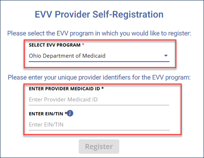☐ Register in the Sandata EVV Provider Registration Portal. Choose Ohio Department of Medicaid for the EVV Program, then enter your Provider Medicaid ID and EIN/TIN. As an independent provider, your Tax Identification Number (TIN) is your Social Security Number. Enter that in the EIN/TIN field.