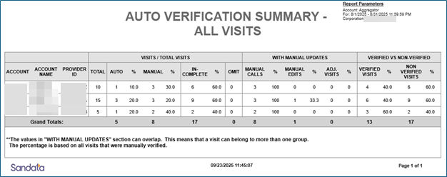This report allows users to compare the number of automatically verified visits versus total visits. This report displays cross-agency visit verification trends, which provides an overview of the overall program compliance. To minimize manual editing, auto-verified visits are preferred. This improves visit capture and reduces provider agency workload.