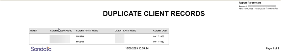 This report helps to identify duplicate client records, as identified by matching client last name and date of birth. This report can be exported as both a CSV and an Excel file. This is a daily report.