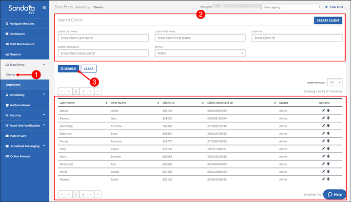 Sandata Technologies Product Help Sandata EVV Clients in EVV Searching for a Client 1. Navigate to the Clients screen. (Data Entry > Clients) 2. Enter the search criteria. 3. Click SEARCH. Note: Searching with no criteria selected displays a complete list of clients. Clients Screen Comments 0 comments Please sign in to leave a comment.