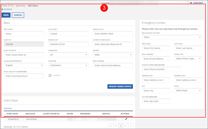 Use the Edit Client screen to update a client profile. Addresses, phone numbers, contacts, designees and payers can be updated on this screen. Depending on program rules, some fields may not be available for editing. Users can also request a mobile visit verification device, if allowed by program rules, from this screen.