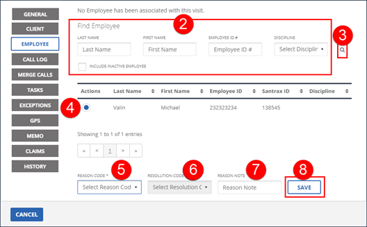1. Navigate to the Employee section of the Visit Details screen. (Visit Maintenance > search for and open a visit (