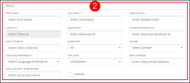 Note: To prevent duplicate client profiles, search to ensure there is not an existing profile before creating a new client profile. Duplicate client entry is prevented based on the Client ID and/or Medicaid ID. |