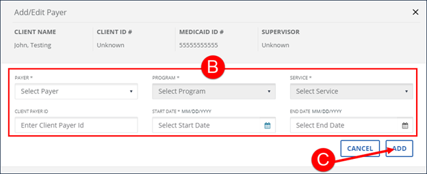 3. Use the Client Payer section to add a payer, program and service, if required.
