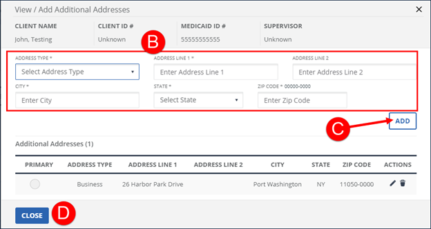 C. Click ADD and the additional address displays in the Additional Addresses (x) section.