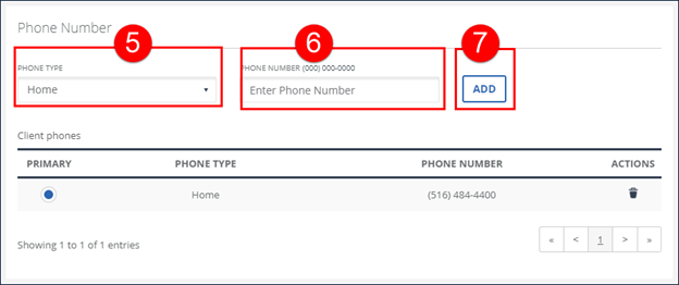 Note: The first phone number added is set as the client’s primary phone number. If the client has multiple phone numbers, select the radio button in the PRIMARY column to set that number as primary. |
