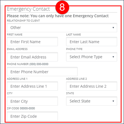 8. Enter all applicable fields in the Emergency Contact section.