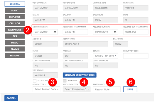 If a visit has missing and/or incorrect dates or call in/out times, use the General tab of the Visit Details screen to manually enter the adjusted dates and/or times. In order to save a visit that has been modified, users may be required enter a REASON CODE and RESOLUTION CODE. REASON CODE and RESOLUTION CODE fields only display if the system is configured to support that functionality.